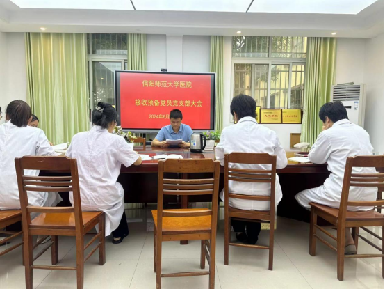 6月4日下午,信阳师范大学医院直属党支部在二楼会议室召开2024年上半年接收预备党员支部大会,全体党员参加本次会议。会议由张景伟主持。